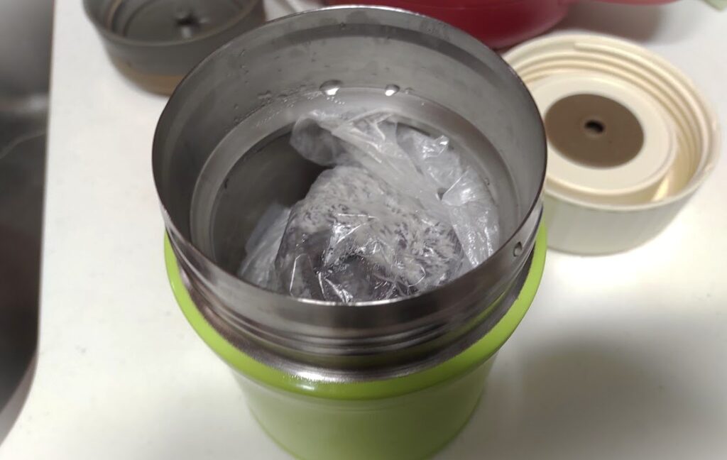 3. ビニール袋(アイラップ)にタオルを入れて、お湯を捨てたスープジャーの中へ。