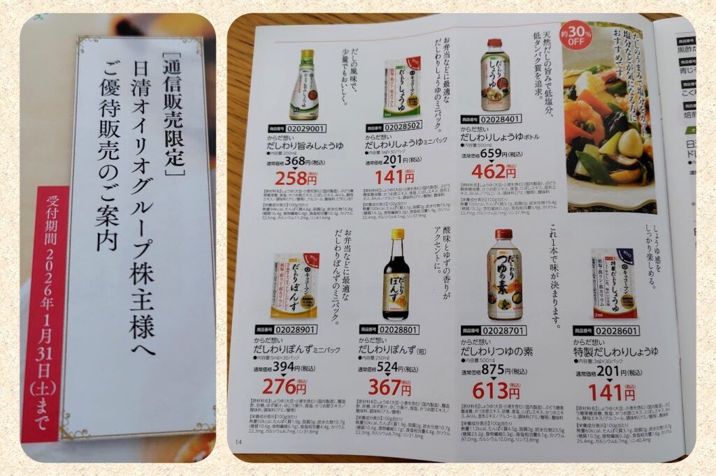 私の目的の【だしわりしょうゆ】以外にも、通信販売限定のお高いオリーブオイルや亜麻仁油やMCTオイルなどの健康オイルやドレッシングやお茶やサプリなどなどが載っていて、1万円以上買うと更にプレゼントまであったりする。