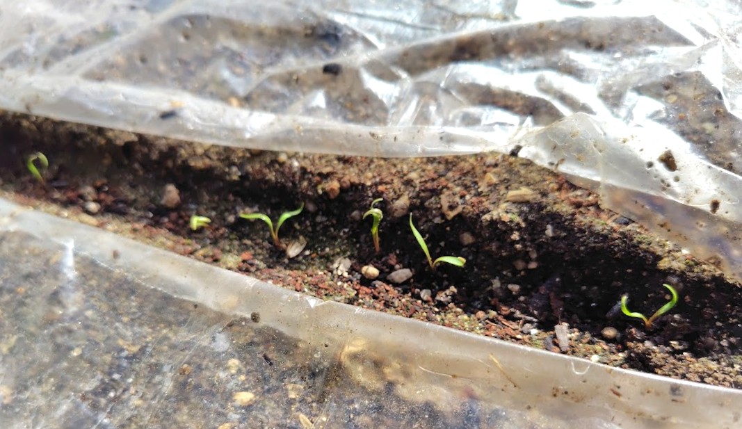 ほぼ全部の蒔き筋に芽が確認できたので、