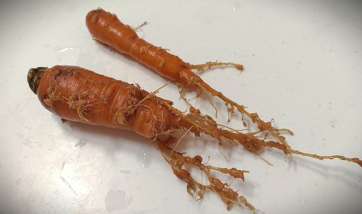 センチュウが根に寄生して養分を吸いニンジンが太れず、形がひどく崩れてしまいます。