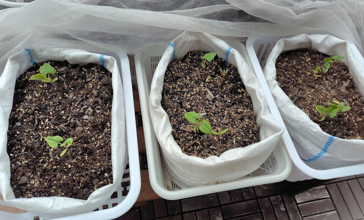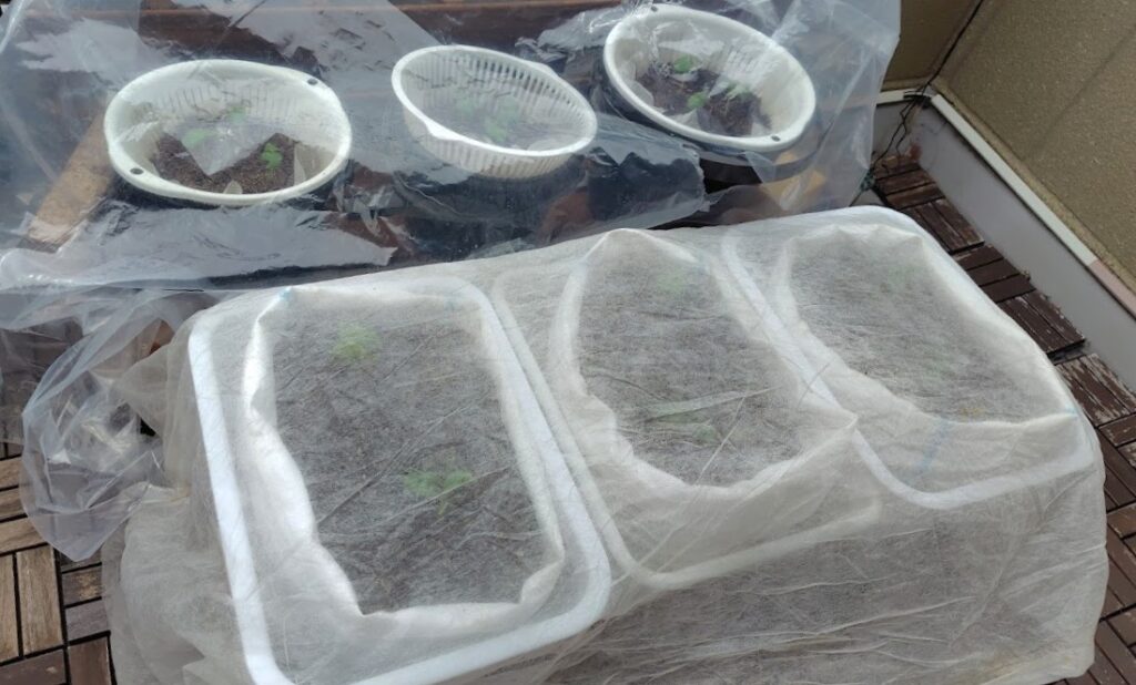 • 気温が下がる夜は、軒下に移動させて不織布の上にビニールも被せた。