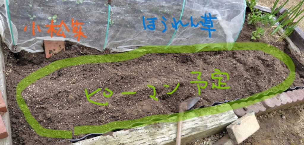 (↑写真)畑の上側には小松菜とほうれん草が若苗が植えてある。