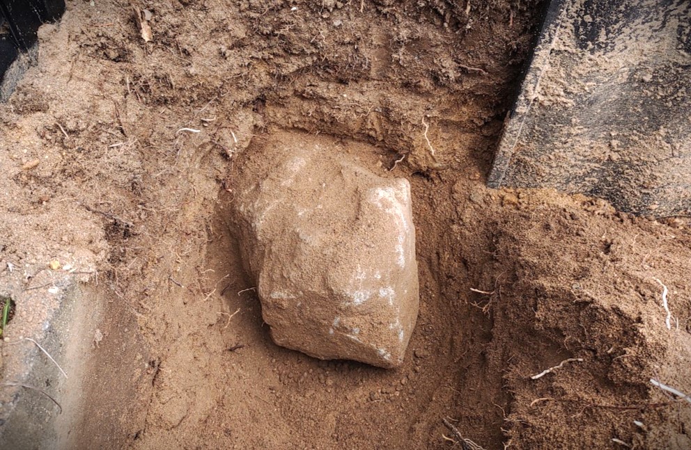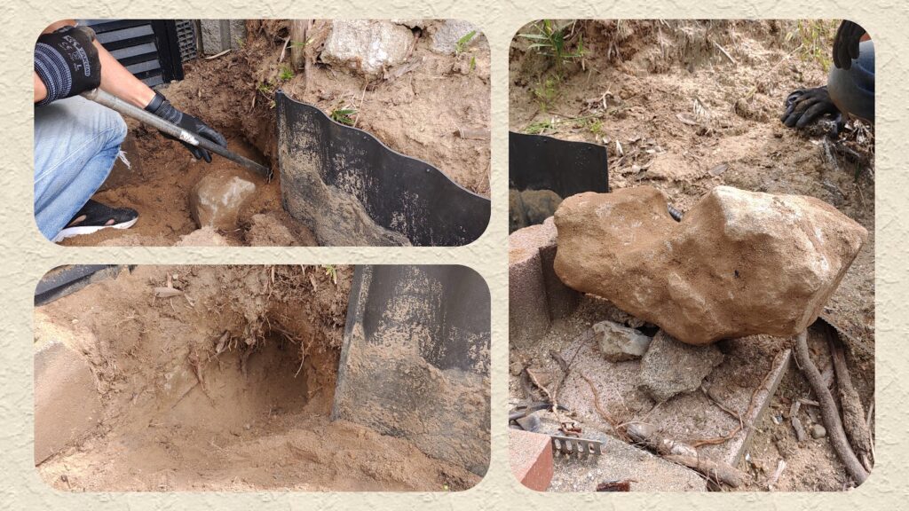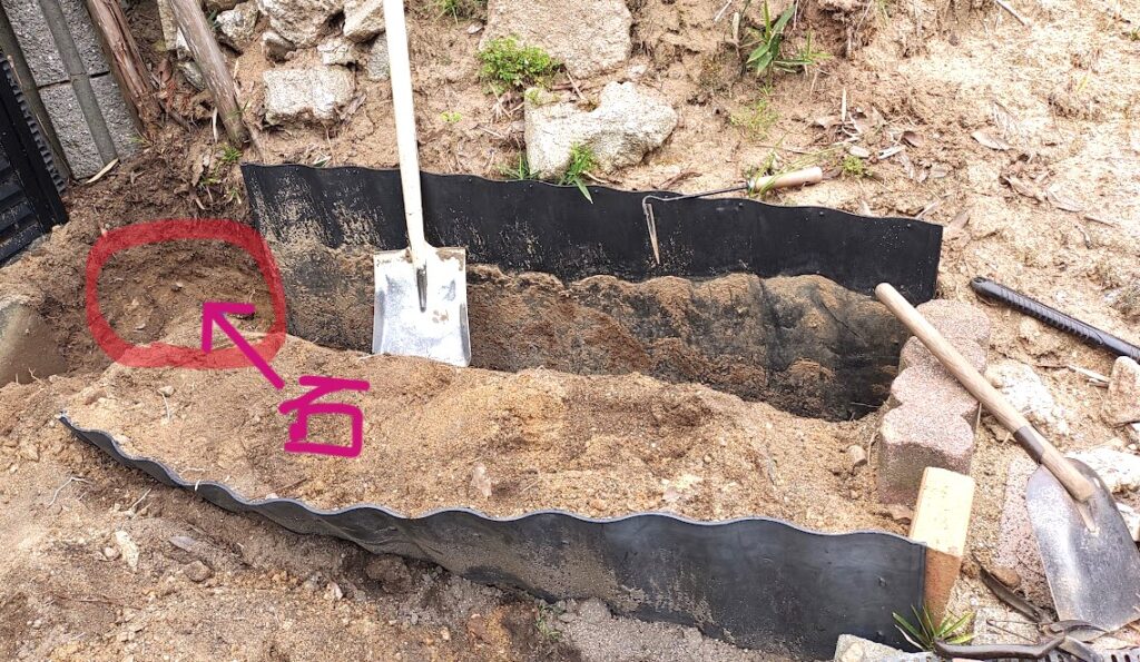 左側の隣との境界まで畔板を設置したくて掘ってると、大きな石が出て来て…