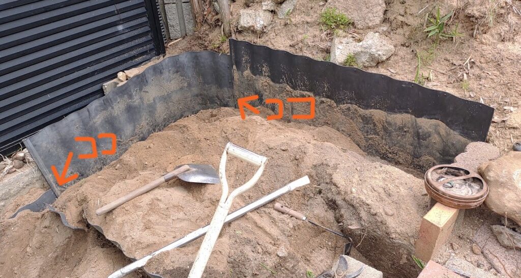 まずは斜面との境の畔板をもっと深くに差し込む為に、